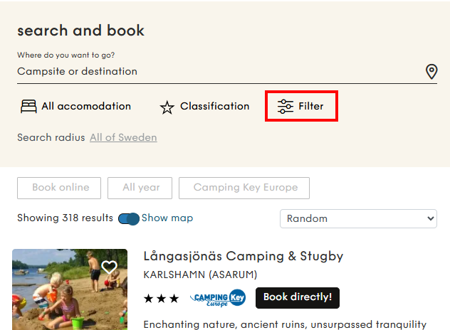 Use the filtered search at Camping.se to find campsites that welcomes pets. Under General facilities choose Dogs welcome.