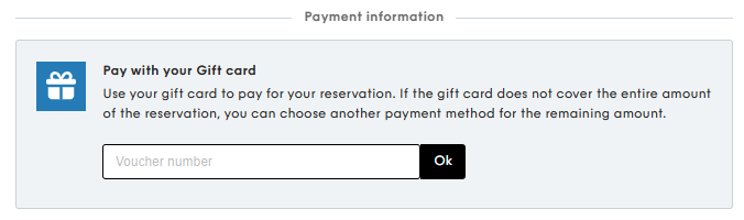 When you have selected your accommodation, add it to your shopping cart, and when you reach the “Your details and payment” step, enter your gift card number as described below and click OK.